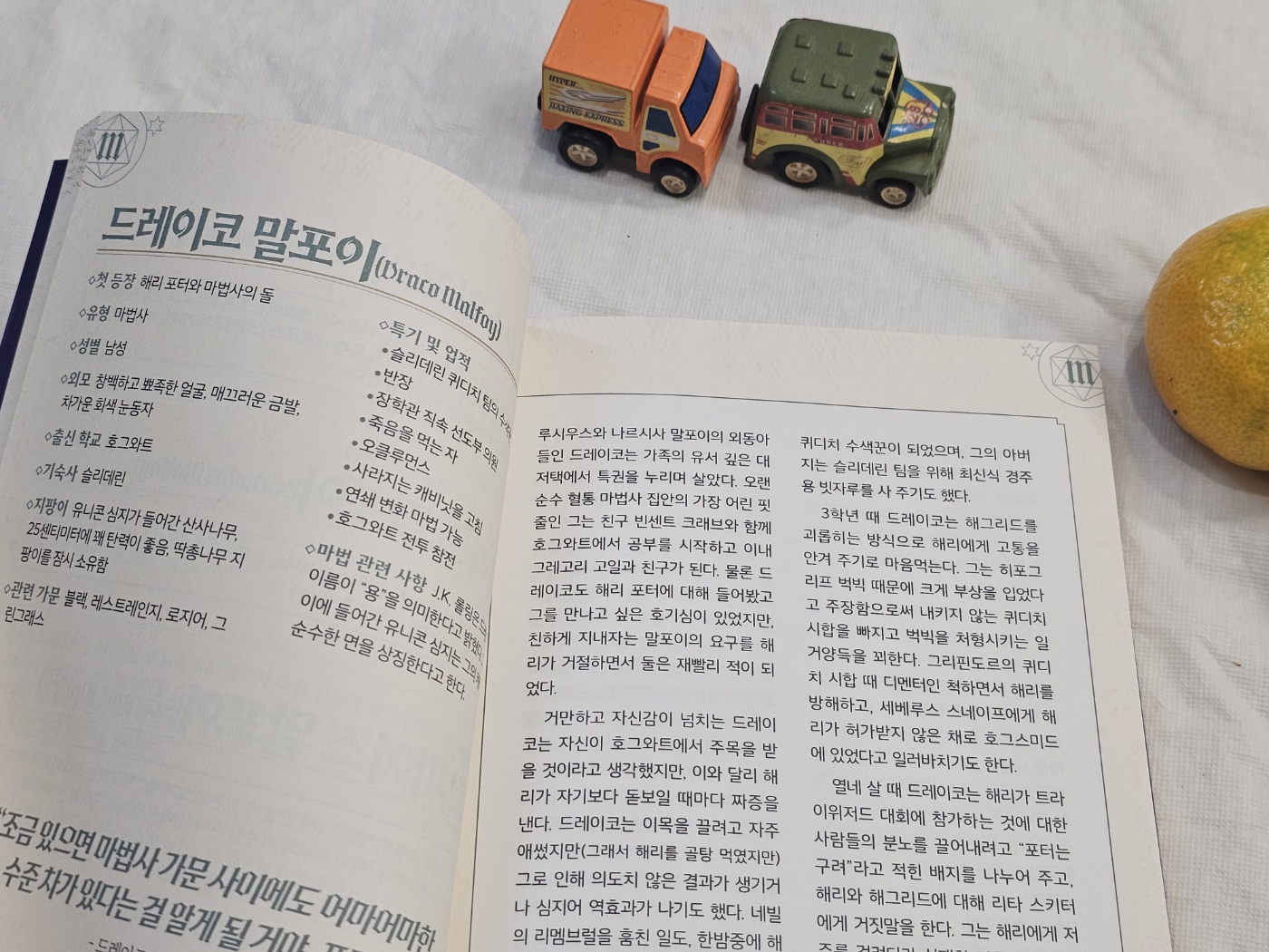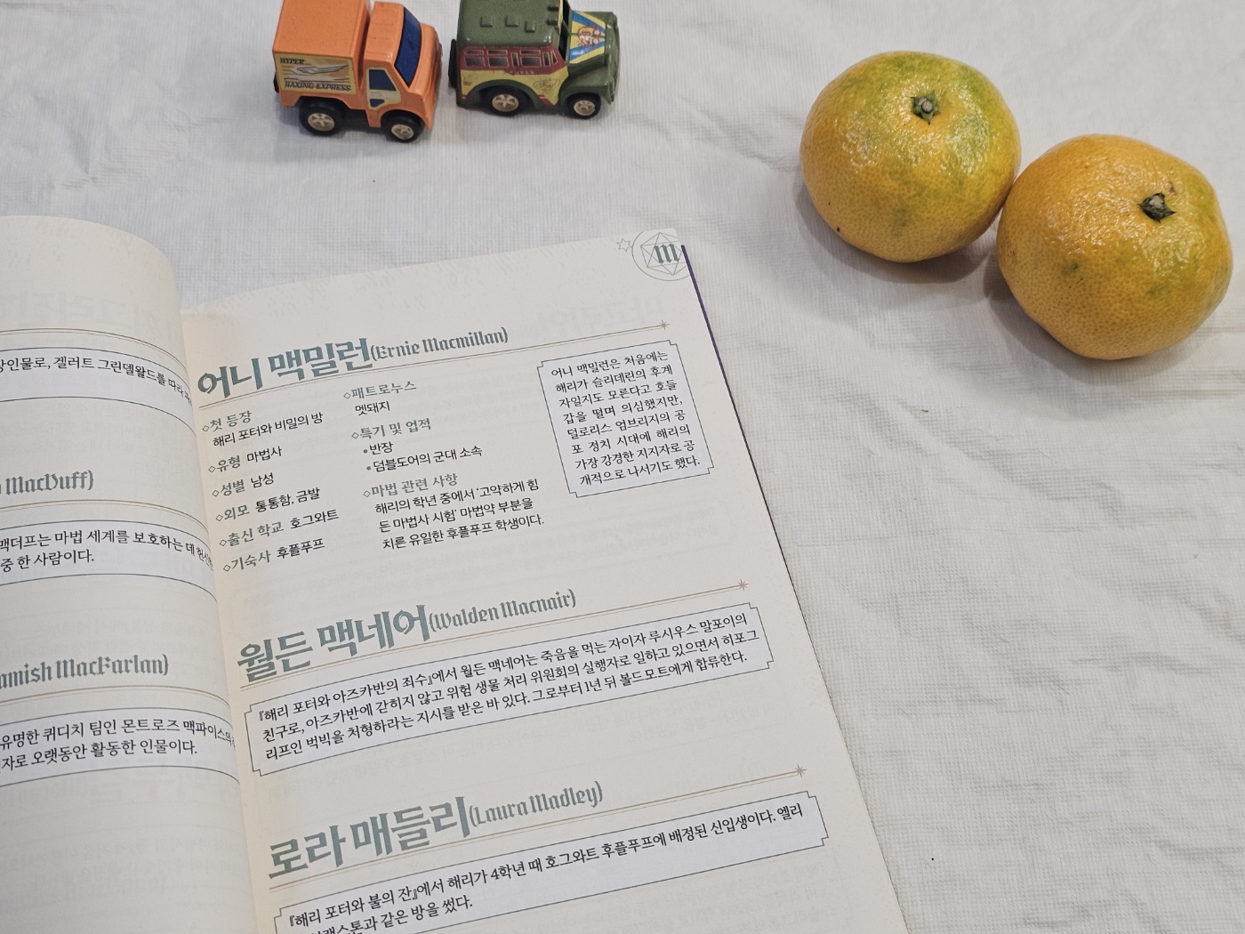 엉뚱한 괴짜 마녀 루나 러브굿에 대한 페이지를 읽을 때도 "맞아! 얘가 이랬지." 하면서 집중했어요. 루나는 비행 자두 귀걸이를 끼고 버터 맥주 코르크 목걸이를 하는 등의 특이한 스타일로 유명한 소녀였죠. 그리고 루나는 해리포터가 볼드모트가 돌아왔다는 증언을 믿어준 인물이기도 했습니다. 이런 조연이 없었다면 해리포터는 절대 빛나지 못했을 거예요.