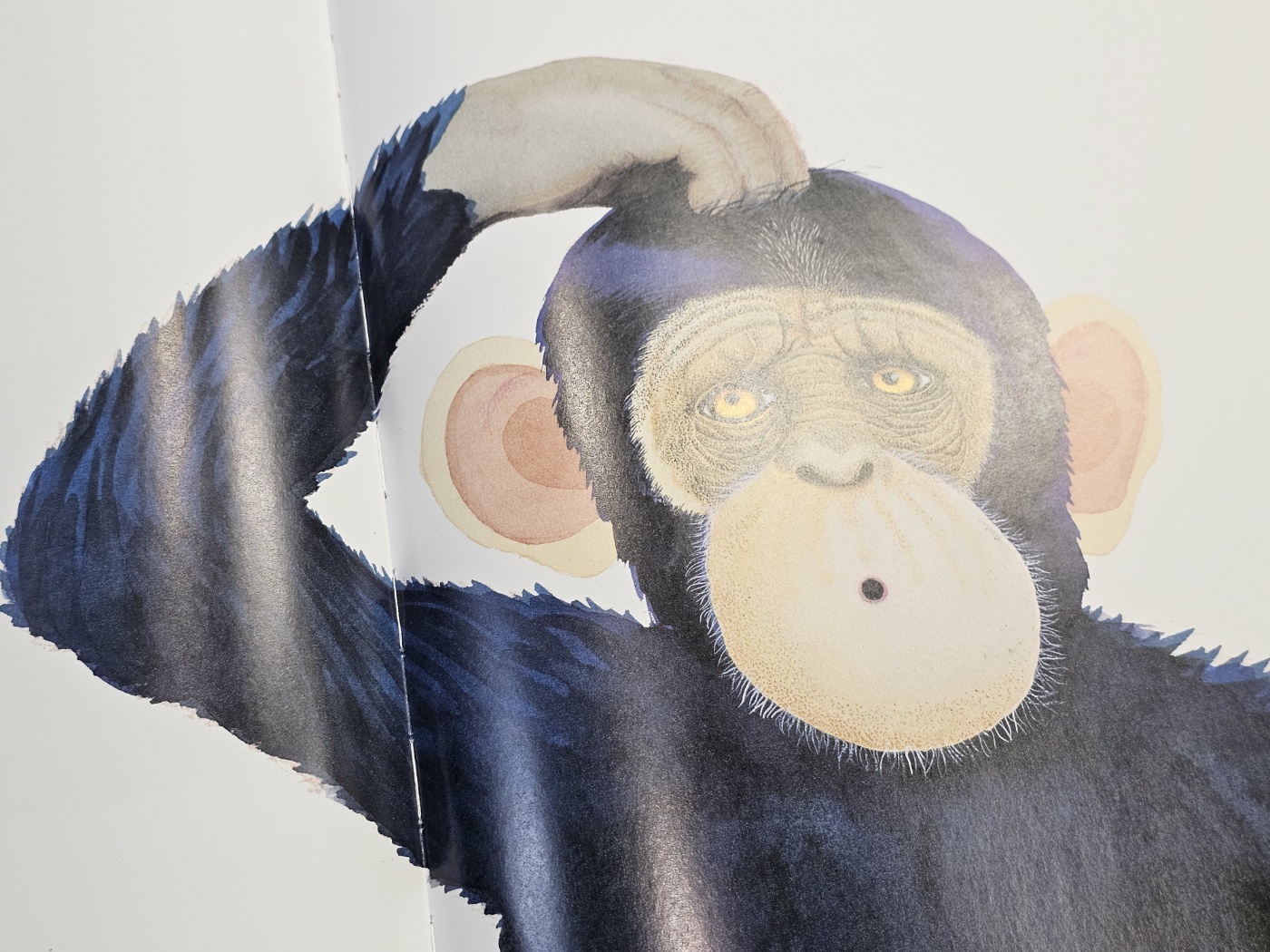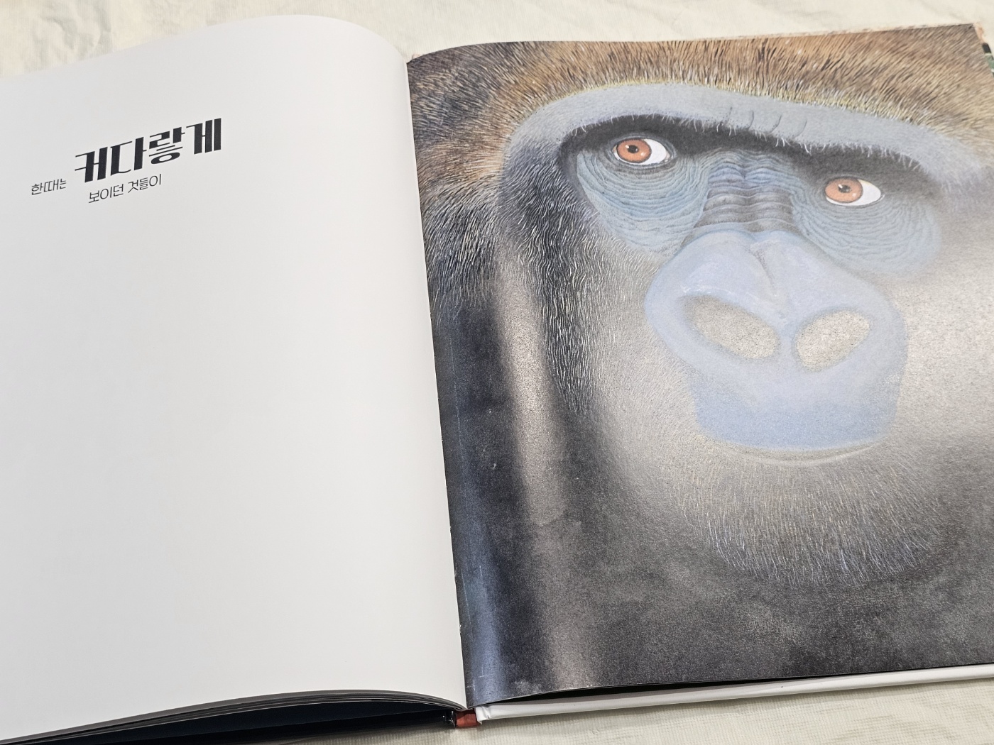 한 장을 열어보면 커다란 고릴라의 손 위에 작은 원숭이 한 마리가 놓여 있어요.