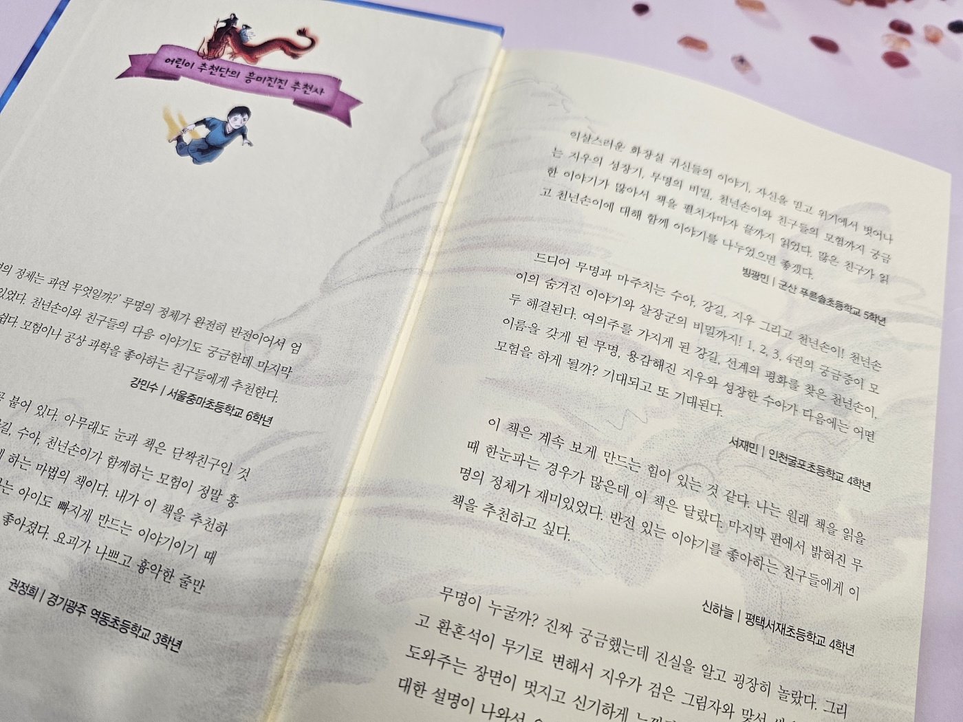 이 작품은 판타지, 무협 장르를 좋아하는 독자라면 무척 즐겁게 읽을 수 있습니다. 솔직히 이 책을 읽기 전에는 별로 큰 기대를 하지 않았습니다. 어린이를 대상으로 한 아동문학은 무언가 뻔한 패턴이 보이기 때문입니다. 어린이들에게는 좋은 작품이어도 성인은 읽을 수 없는 작품이 많잖아요. 그런데 <천년손이 고민해결사무소 5>는 어른인 제가 읽어도 전혀 시시하지 않고 흥미로웠습니다. 심지어 저는 1~4권까지는 읽지 않고 바로 5권부터 읽기 시작했는데요. 내용을 이해하는 게 어렵지 않았습니다. 일단 책의 앞부분에 등장인물들이 잘 소개되어 있어서 이 부분만 잘 읽어도 내용이 전혀 헷갈리지 않아요. 만약 1~4권을 읽지 않은 독자분이라면 5권을 읽기 전 반드시 등장인물 페이지를 읽는 것을 추천합니다.