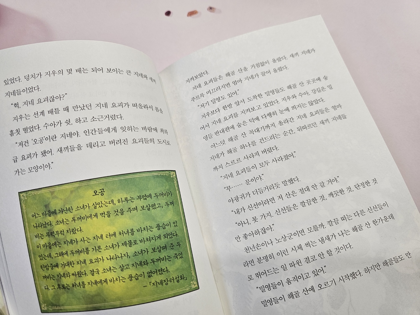 이 책은 어린이들의 현실을 그대로 담아낸 이야기가 아닙니다. 선계의 용, 요괴, 신선 등이 나오는 상상의 세계가 펼쳐져 있어요. 인간계, 선계, 명계로 나뉘어진 세상이 배경인데, 전혀 생각하지도 못했던 사건들이 나와서인지 책을 펼치는 순간 눈을 뗄 수 없었습니다. 검은 그림자를 보는 소년 지우는 담임 선생님의 정체를 알게 되고 깜짝 놀라는데요. 저도 평범한 선생님의 정체가 밝혀졌을 때 경악을 할 정도였습니다. 그는 바로 요괴사냥꾼이었거든요. 그런데 평범한 요괴사냥꾼이 아니고 천년손이의 라이벌이어서 천년손이와의 대결구도가 재미있었습니다.